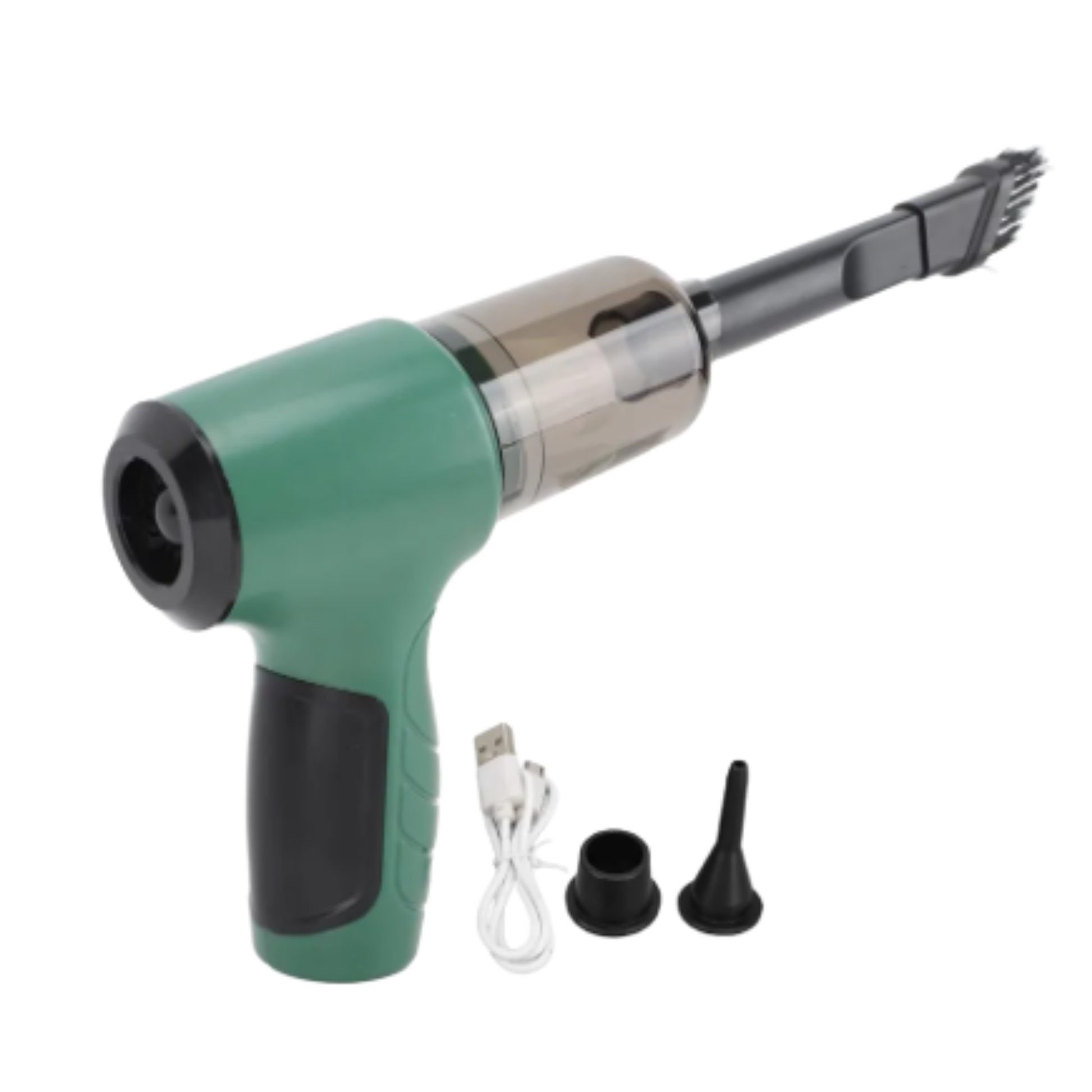 Con su potente succión y capacidad de 0.2 L, elimina polvo, migas y hasta líquidos 💧. Además, incluye función sopladora, perfecta para limpiar teclados, rincones o inflar objetos.