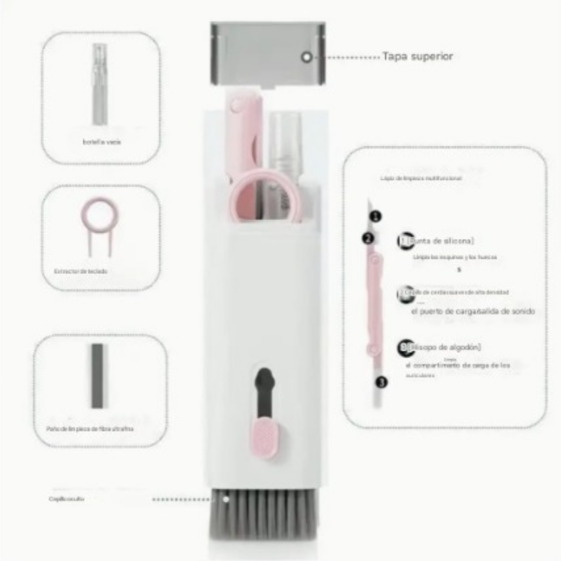Mantén tus dispositivos en perfectas condiciones con este set de limpieza multifuncional diseñado especialmente para teclados, audífonos, celulares y más. Ideal para quienes valoran la higiene, el rendimiento y el cuidado de sus herramientas tecnológicas.