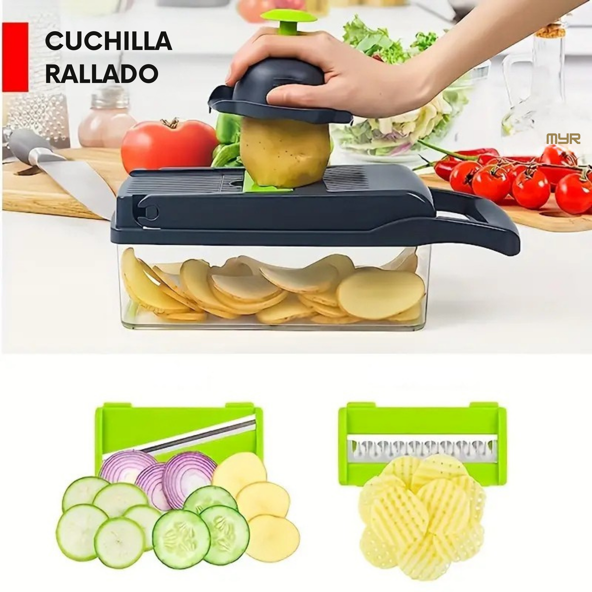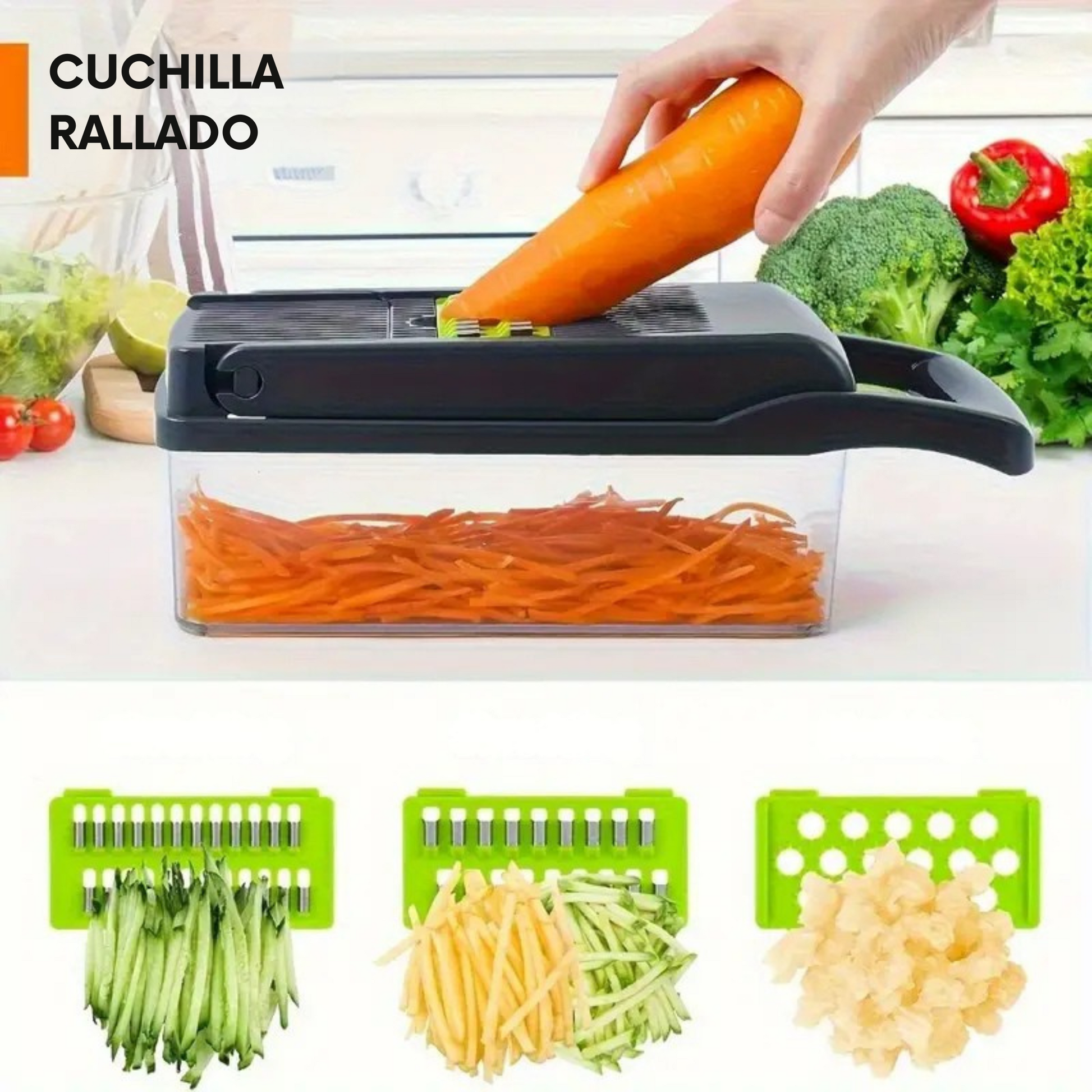 🔹 Incluye 14 piezas: cuchillas intercambiables para distintos tipos de corte (cubos, tiras, rebanadas, rallado y más)