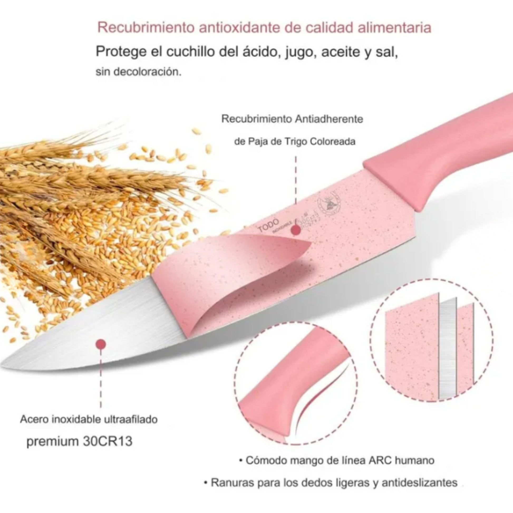 Cada cuchillo tiene un color diferente, ideal para identificar rápidamente su uso y mantener orden e higiene en la cocina.